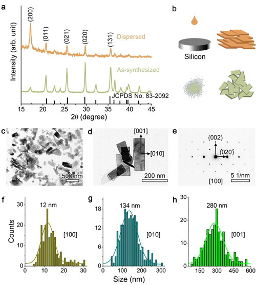 圖1(a)新合成的樣品和把樣品分散后再滴到非晶硅上的XRD圖譜。(b)圖a的示意圖。(c, d)LiFePO4的TEM圖。(e)對應(yīng)(d)的電子衍射花樣。用高斯函數(shù)擬合LiFePO4晶粒沿著不同方向的尺寸統(tǒng)計數(shù)據(jù)。(f)a軸,12 nm,(g)b軸,134 nm,(h)c軸,280 nm。