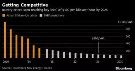 據(jù)彭博新能源財(cái)經(jīng)數(shù)據(jù),電動(dòng)汽車(chē)價(jià)格需要下降一半以上,才能與一般的內(nèi)燃機(jī)驅(qū)動(dòng)汽車(chē)競(jìng)爭(zhēng)。到2026年,這種情況很可能會(huì)發(fā)生,到時(shí)電池組的成本預(yù)計(jì)將下降到100美元/千瓦時(shí)左右。