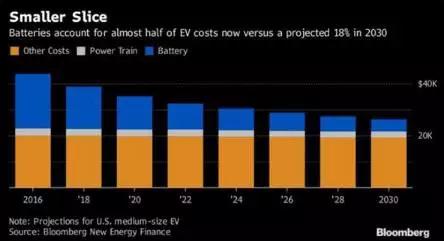 彭博新能源財(cái)經(jīng)預(yù)計(jì),以化石燃料為動(dòng)力的汽車(chē)的平均成本約為2.8萬(wàn)美元,到2030年這一數(shù)字可能會(huì)上升到約3萬(wàn)美元。為了降低成本取代燃油車(chē),電動(dòng)汽車(chē)將在未來(lái)9年內(nèi),預(yù)計(jì)會(huì)依靠電池成本預(yù)計(jì)下降67%。