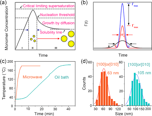 圖1 經(jīng)典的LaMer形核和生長(zhǎng)機(jī)制以及實(shí)驗(yàn)結(jié)果。(a)經(jīng)典LaMer機(jī)理,顆粒在溶液中成核和生長(zhǎng)過(guò)程中單體濃度變化的示意圖。(b)三個(gè)具有高斯分布的形核函數(shù)。形核函數(shù)的寬度(