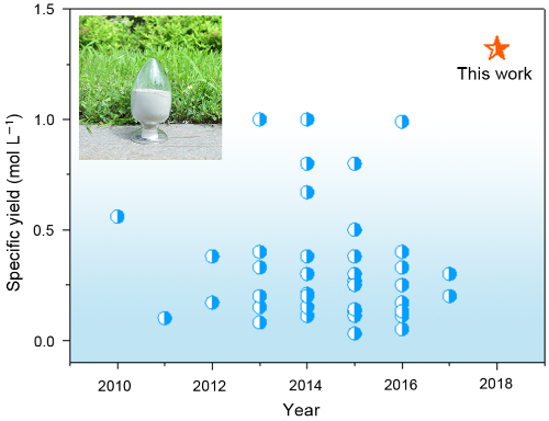 圖3 水熱/溶劑熱合成方法制備LiFePO4單位體積產(chǎn)率的比較。插圖為本工作中合成的LiFePO4的光學(xué)照片。